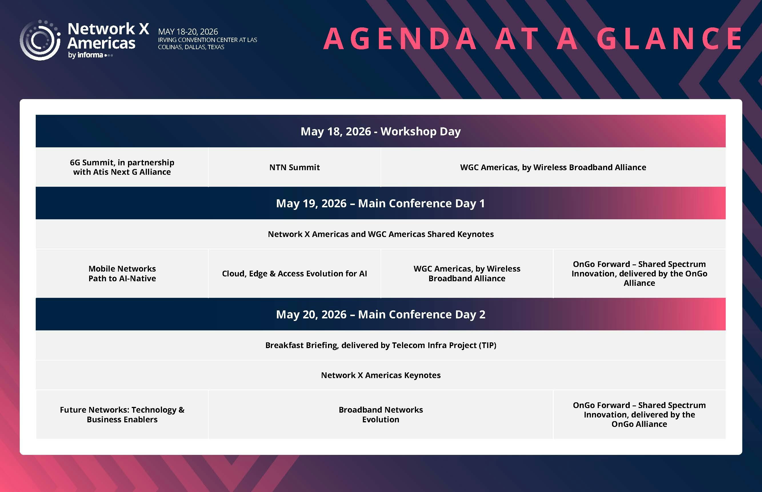Network X Americas is where the convergence of mobile, fixed, Wi-Fi, and satellite connectivity meets the transformative power of artificial intelligence. Join us for the 2026 iteration of the event to explore new ideas, learn and engage with industry leaders, and witness the future of connectivity unfold.