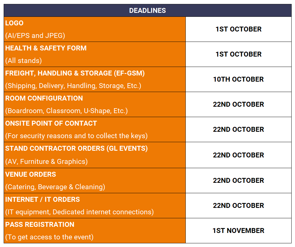 Important: The order deadline is 22 October. All orders are to be confirmed & paid for in full prior to the Event. All exact deadlines for service orders are on the forms. Please complete and pay them by the deadline to finalize your order and avoid any surcharges. Late orders may receive a surcharge of up to 20%.