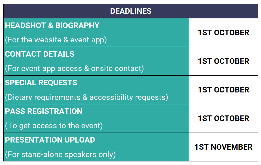 Here you will find the relevant information for your session(s). Please ensure you read each section carefully and meet the required deadlines. If you have any questions, please contact your dedicated speaker logistics manager. We look forward to working with you in making this a successful event!